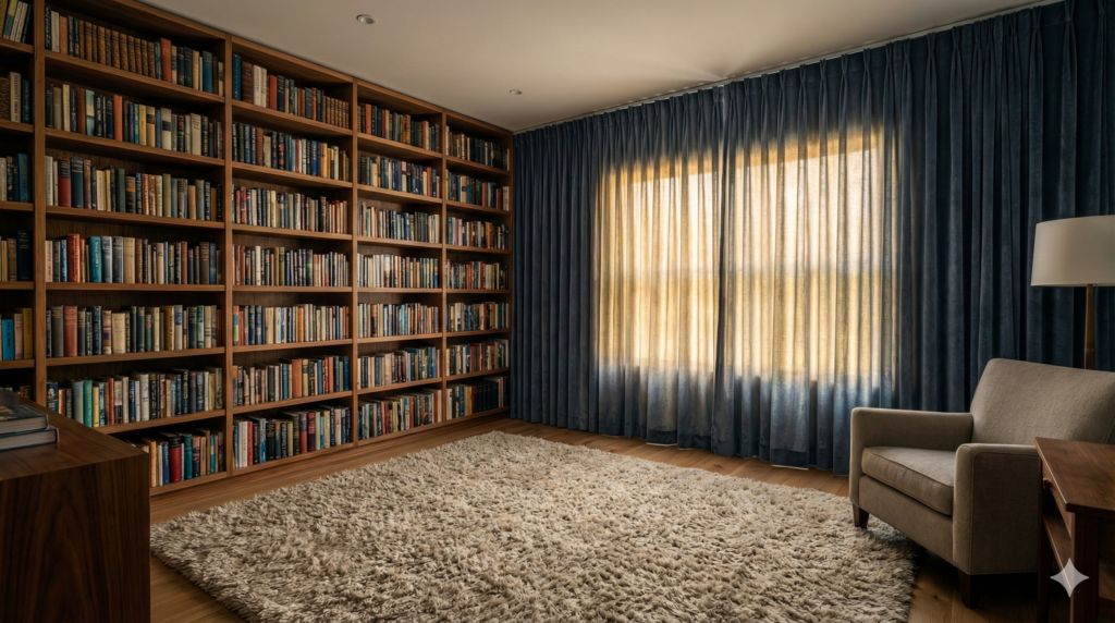 - Cortinas acústicas (o muy gruesas): Olvida los visillos finos. Busca cortinas de terciopelo grueso o aquellas etiquetadas como «Blackout» (opacas). Cuantos más pliegues tenga la cortina, mejor romperá la onda sonora. Deben cubrir toda la ventana y, si es posible, ir de techo a suelo.