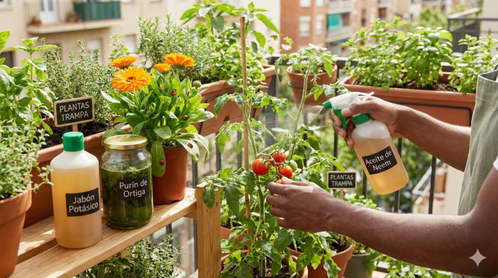 En un balcón pequeño, una plaga puede saltar de una maceta a otra en cuestión de horas. No necesitas pesticidas tóxicos que contaminen tus alimentos; necesitas estrategia.