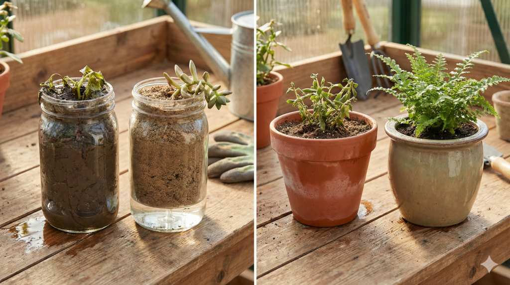 - Plástico o Cerámica vitrificada: No son porosos. Retienen la humedad mucho más tiempo, lo que aumenta el riesgo de hongos si te excedes.