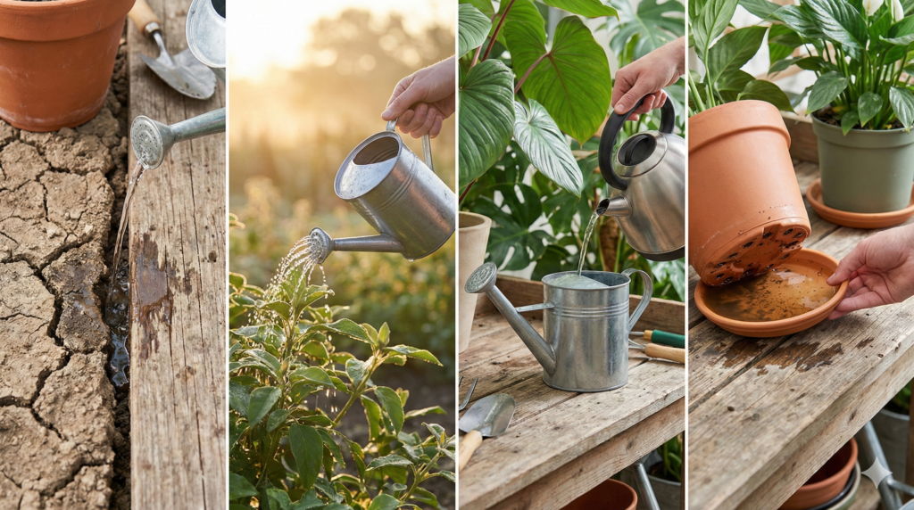 - El efecto «Sorbete»: Cuando una planta está muy seca, la tierra se separa de las paredes de la maceta. Si riegas rápido, el agua se escapará por esos huecos sin mojar las raíces. Secreto: Riega primero un poco para «ablandar» la tierra, espera 5 minutos y luego realiza el riego completo.