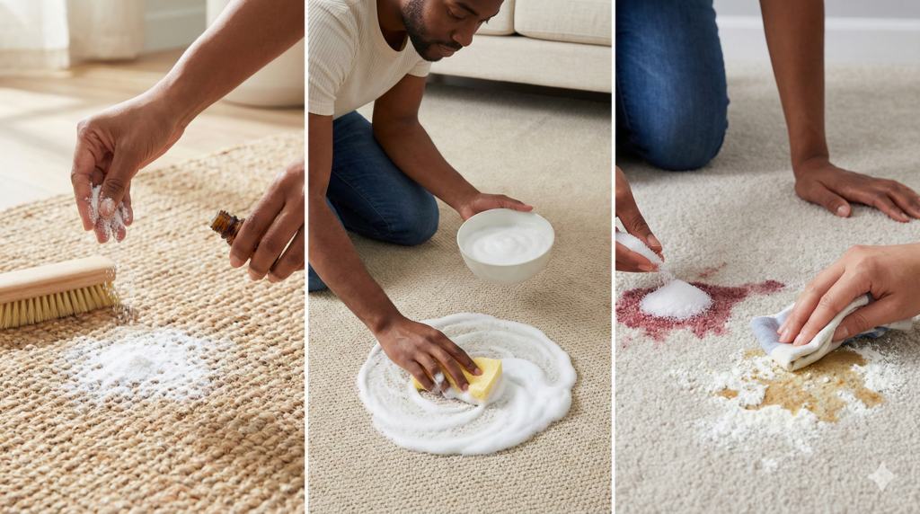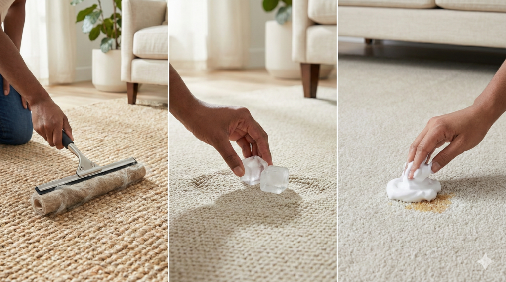 Para manchas de maquillaje o zumo en alfombras de color claro, la espuma de afeitar clásica (la blanca, no el gel) es milagrosa. Aplica un poco, deja actuar 10 minutos y retira con un paño húmedo. Los agentes tensioactivos de la crema levantan la mancha sin dañar el tejido.